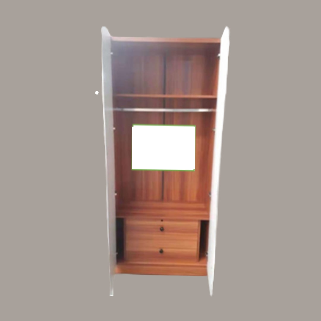 This adaptable and multifunctional wardrobe-cabinet offers a variety of storage options to accommodate all your needs. Behind the two doors, you'll find a series of shelves and drawers for clothing storage, complete with a metal rod for hanging suits and dresses. The two framed doors are finished in dual palette colors, allowing this piece to seamlessly blend into the transitional style and fit well in any room, regardless of its decor.
